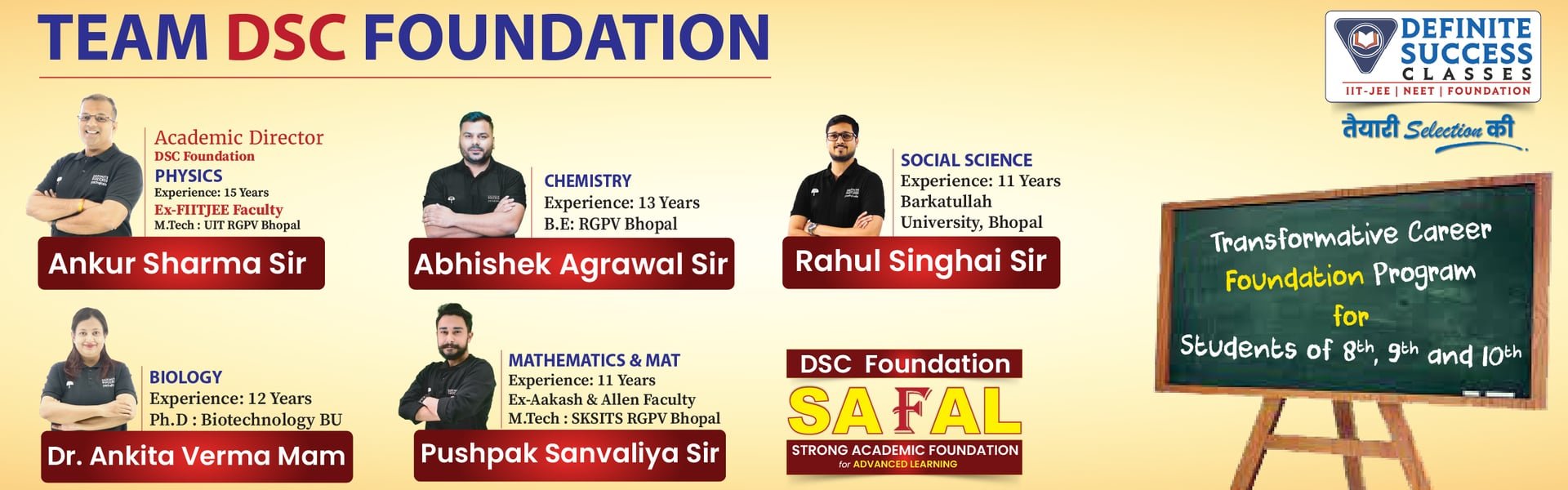 Definite Success Classes is more than an institute; it is a platform where dreams take flight and aspirations turn into achievements. Founded by some of the most experienced and accomplished mentors of Central India, our faculty team carries a remarkable legacy of excellence in entrance exam preparation. Their proven track record of producing top selections in competitive exams reflects their commitment to student success and their expertise in nurturing future achievers. Our approach goes beyond academics. At Definite Success Classes, we focus on instilling values like discipline, dedication, determination, and a relentless zeal to never back down. These qualities, combined with our well-structured academic programs, create an environment where students can flourish both personally and professionally. Whether you’re preparing for NEET, JEE, or aiming to build a solid foundation in grades 7th, 8th, 9th, and 10th, our meticulously designed programs provide a clear pathway to success. Our highly qualified and experienced faculty ensure that students not only master the curriculum but also develop the confidence, problem-solving skills, and strategic thinking required to excel in the nation’s toughest exams. At Definite Success Classes, we believe every student deserves personalized care and mentorship. We monitor their academic journey closely, offering tailored guidance and support to help them overcome challenges and reach their full potential. From regular assessments to one-on-one mentoring, we ensure no student is left behind. We take pride in being a premier institute where dreams of getting into top medical, engineering, or other competitive fields come true. By creating a positive and inspiring learning environment, we empower students to dream big, stay determined, and achieve extraordinary success. Join Definite Success Classes and take the first step toward a bright and successful future. Together, let’s transform your dreams into reality.